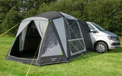 Das Busvorzelt Liberta Air ist ein aufblasbares und freistehendes Vorzelt mit gekreuztem Gestänge für Fahrzeuge mit einer Regenrinnenhöhe von 170 – 210 cm. Die Gesamthöhe beträgt 230 cm.