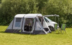 Freistehendes und aufblasbares Busvorzelt für Fahrzeuge mit Regenrinnenhöhe von 180 – 220 cm. Die Gesamthöhe beträgt 240 cm.