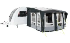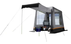 Freistehendes und aufblasbares Busvorzelt für Fahrzeuge mit Regenrinnenhöhe von 180 – 220 cm. Die Gesamthöhe beträgt 240 cm.