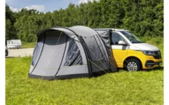 Freistehendes Busvorzelt mit moderner Lufttechnologie für Fahrzeuge mit einer Regenrinnenhöhe von 180-220 cm. Dank robustem Vier-Jahreszeiten-Material ist das Touring Air 4 Season zu jeder Jahreszeit einsetzbar! Das integrierte Regenschutz-Vordach ermöglicht eine optimale Ventilation auch bei schlechten Wetterverhältnissen. Die freistehende Luft-Konstruktion ermöglicht einen schnellen Aufbau und maximale Flexibilität am Urlaubsort. Die Gesamthöhe beträgt 205 cm.
