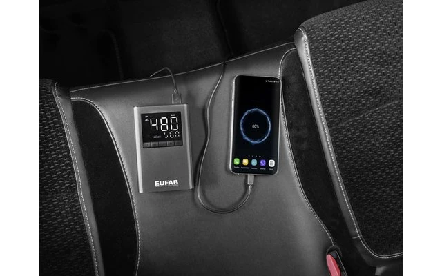 Es kann als Powerbank zum Aufladen von z. B.Mobiltelefonen verwendet werden. Der gewünschte Druck kann eingestellt werdendas Gerät schaltet nach Erreichen automatisch abMit praktischer Transporttasche