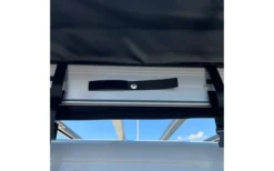 Sobald die Basis am Fahrzeug befestigt ist, kann die Höhe der Kabine mit Hilfe der Begrenzungsbänder (je nach Größe des Fahrzeugs) eingestellt werden, um zu verhindern, dass der Stoff unnötig am Boden reibt und schmutzig oder beschädigt wird.
