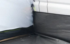 Das frei stehende Kuppel-Vorzelt Milestone Shade eignet sich perfekt für kleinere Campingplätze. Es verfügt über eine Tür an der Seite der Link Access Zone und einen Seiteneingang sowie über eine Gewebebahn zur Höhenverstellung an der Innenseite. Das Vorzelt lässt sich schnell und einfach an Bussen mit einer Höhe zwischen 175 und 200 cm anbauen. Die flach zusammenfaltbare Vordertür unter dem abgerundeten Vordach ist mit einem Moskitonetz ausgestattet und die durch Netzstoff geschützte Belüftungsöffnung an der Spitze verbessert das Klima im Zelt. Vorderseite lässt sich für mehr Flexibilität vollständig öffnen: die Frontwand und der Eingang werden mithilfe eines Vier-Wege-Reißverschlusses geöffnet, um einen Verandabereich zu schaffen, der durch ein Moskitonetz geschützt ist.