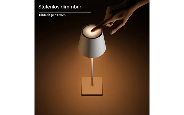 Innen & Außen: Die dimmbare Akku-Tischleuchte für den Wohn- und Außenbereich hält dank Schutzklasse IP54 (spritzwassergeschützt) auch Regenschauer aus.